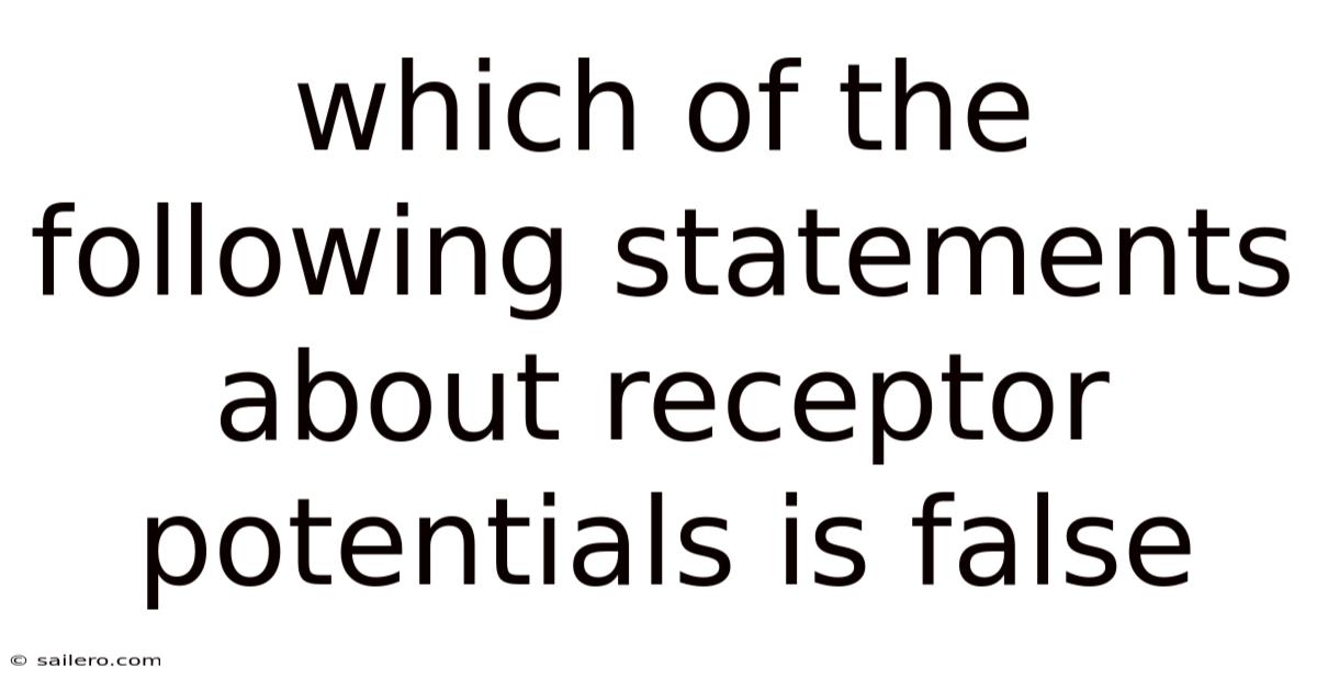 Receptor potentials serve as the first step in converting external cues into electrical signals that the brain can interpret. Now, among the statements examined, only the claim that receptor potentials are all‑or‑none is false. Worth adding: their graded nature, dependence on stimulus intensity, and capacity for summation are fundamental characteristics that differentiate them from action potentials. Recognizing this distinction not only clarifies basic neurophysiology but also supports advanced applications in neuroscience, medicine, and sensory technology.